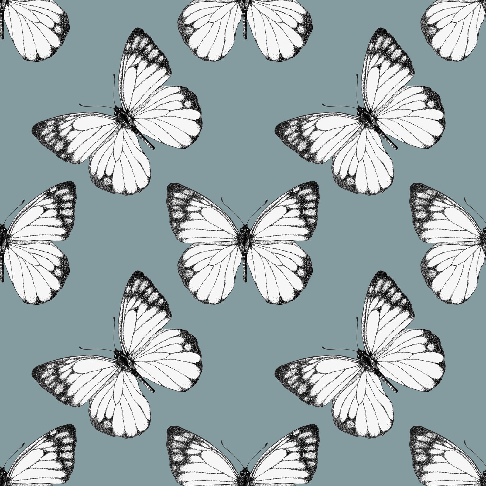 Add a touch of whimsical elegance to your walls with the Butterfly Breeze Blue Grey Wallpaper. This charming seamless design features highly detailed, black-and-white butterfly illustrations set in a uniform pattern against a sophisticated dusty blue background.