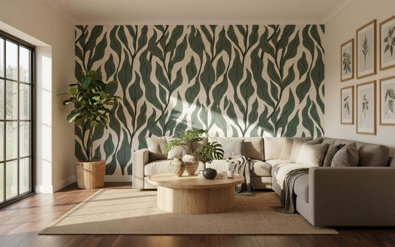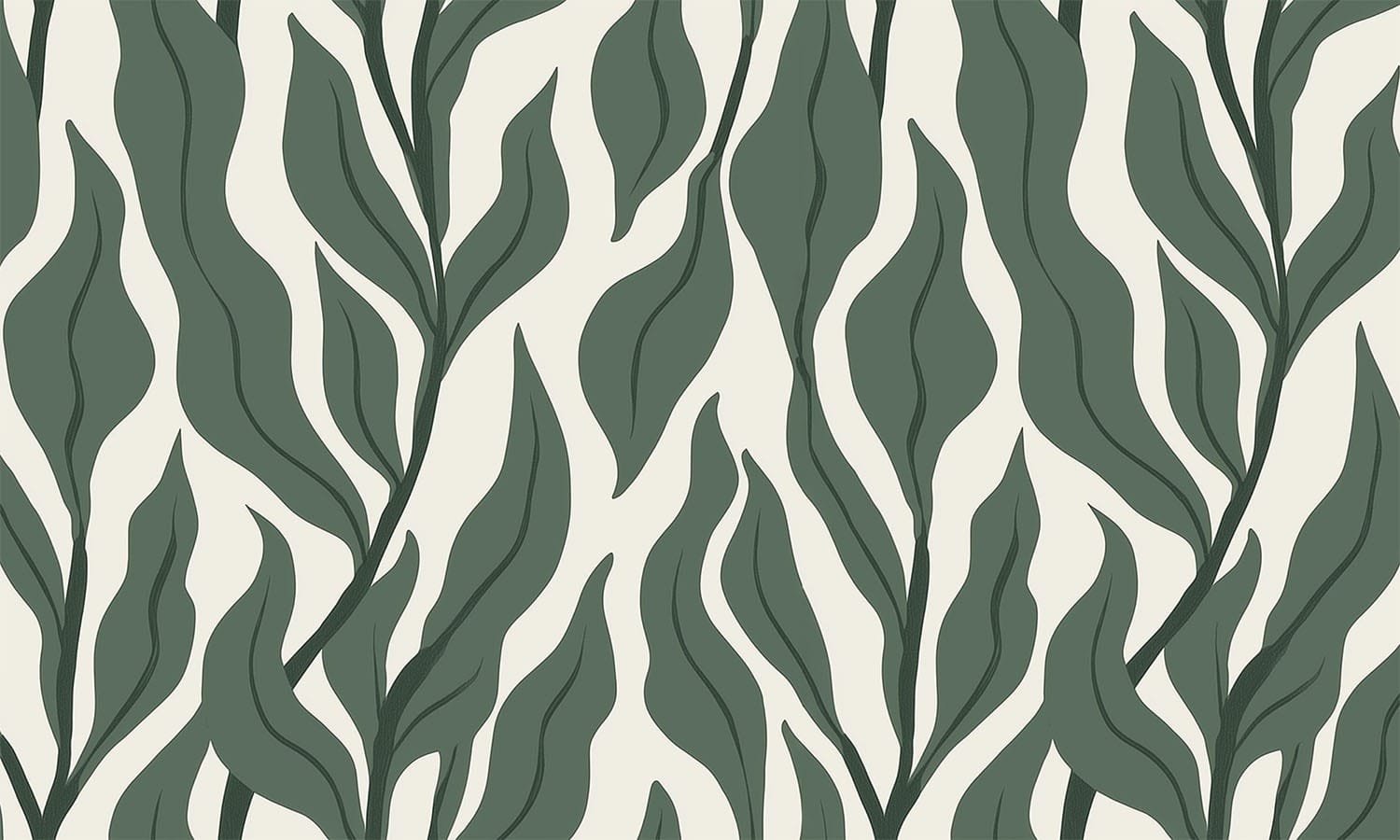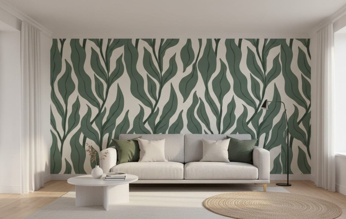Transform your wall into a serene forestscape with the Deep Sage Willow Mural. This large-scale design features sweeping, elongated willow leaves in a rich forest green, set against a warm cream background for a bold, organic statement.