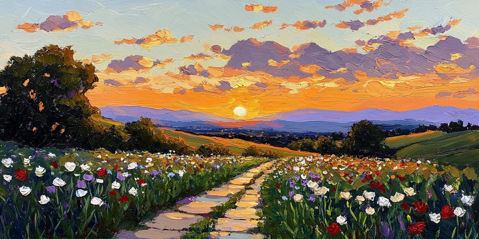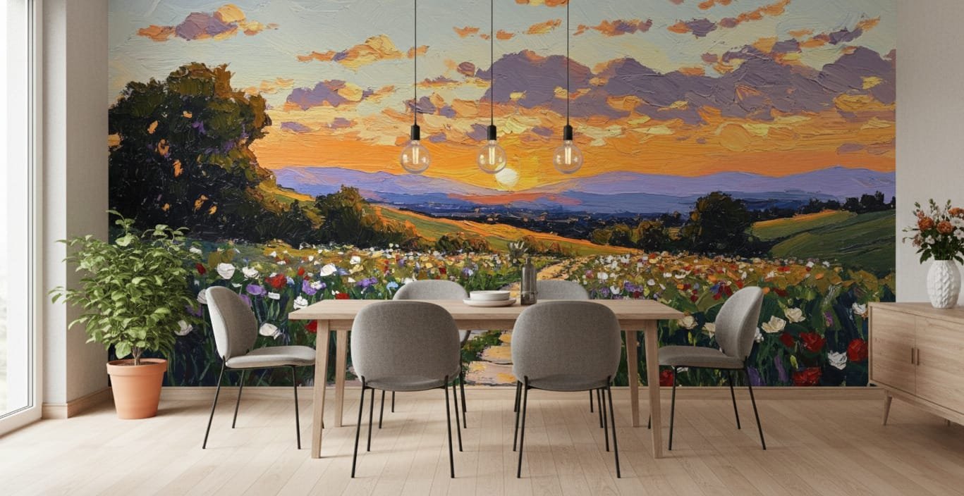 Bask in the golden glow of the Sunset Wildflower Path Mural. This stunning, painterly design features a stone pathway winding through a vibrant field of flowers under a dramatic orange and purple sky, rendered in a rich, textured oil painting style.